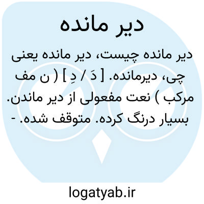 دیرمانده. [ دَ / دِ ] ( ن مف مرکب ) نعت مفعولی از دیر ماندن. بسیار درنگ کرده. متوقف شده.