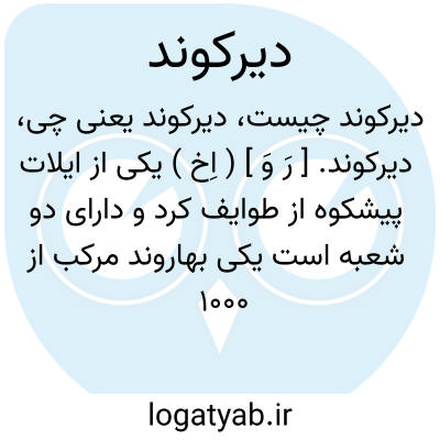 💡 دیرکوند یا دریک وند یکی از ایلات قوم لر ساکن پیشکوه است. سکونتگاه دیرکوندها جنوب شهرستان خرم‌آباد است. بخشی از جمعیت دیرکوندها نیز ساکن شهرستانهای اندیمشک،شوش، دزفول،استان ایلام و ملایر هستند.