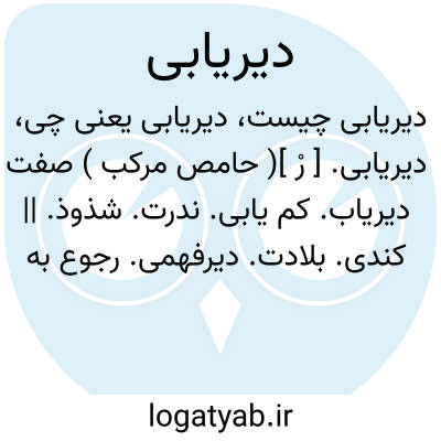 دیریابی. [ رْ ]( حامص مرکب ) صفت دیریاب. کم یابی. ندرت. شذوذ. || کندی. بلادت. دیرفهمی. رجوع به دیریاب شود.