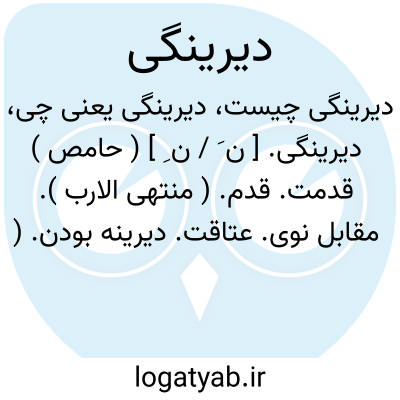 دیرینگی. [ ن َ / ن ِ ] ( حامص ) قدمت. قدم. ( منتهی الارب ). مقابل نوی. عتاقت. دیرینه بودن. ( یادداشت مؤلف ). || ( اصطلاح اداری ) این کلمه بجای سابقه خدمت پذیرفته شده است. ( لغات فرهنگستان ).