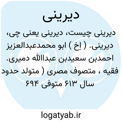 دیرینی. ( اِخ ) ابو محمدعبدالعزیز احمدبن سعیدبن عبداﷲ دمیری. فقیه، متصوف مصری ( متولد حدود سال 613 متوفی 694 هَ. ق. ). او راست: تفسیر منظوم در دو جلد. ارشادالحیاری. التیسیر فی علوم التفسیر. طهارة القلوب ( تصوف ) و غیره. ( از معجم المطبوعات ). و رجوع به اعلام زرکلی ج 1 ص 312 شود.
