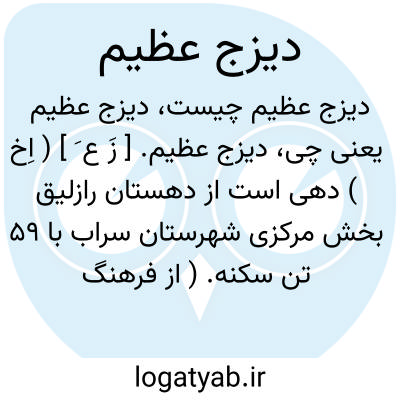 لغت نامه دهخدا دیزج عظیم. [ زَ ع َ ] ( اِخ ) دهی است از دهستان رازلیق بخش مرکزی شهرستان سراب با 59 تن سکنه. ( از فرهنگ جغرافیائی ایران ج 4 ).