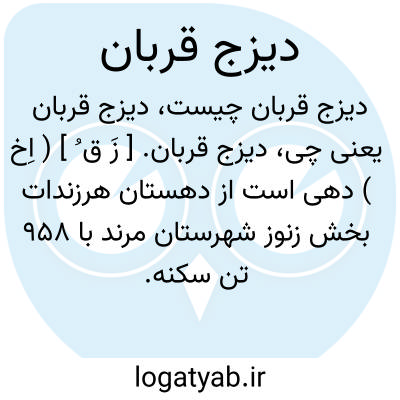 دیزج قربان. [ زَ ق ُ ] ( اِخ ) دهی است از دهستان هرزندات بخش زنوز شهرستان مرند با 958 تن سکنه. ( از فرهنگ جغرافیائی ایران ج 4 ).