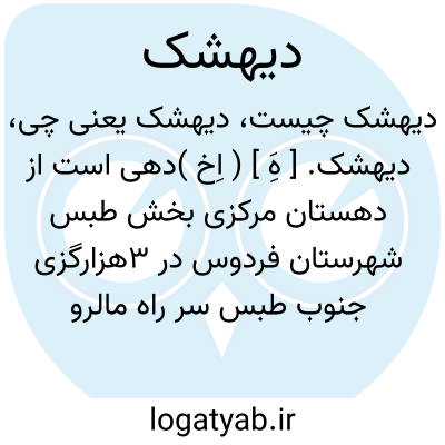 دیهشک. [ هَِ ] ( اِخ )دهی است از دهستان مرکزی بخش طبس شهرستان فردوس در 3هزارگزی جنوب طبس سر راه مالرو عمومی طبس بخداآفرین با 1630 تن سکنه. ( از فرهنگ جغرافیائی ایران ج 9 ).