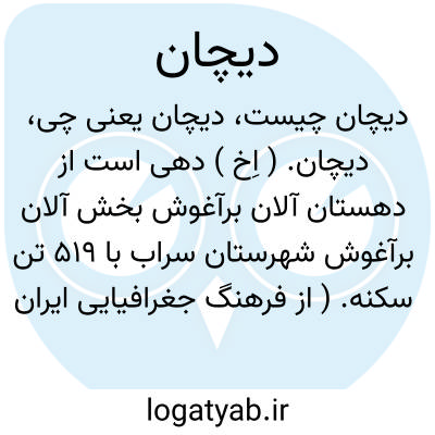 دیچان. ( اِخ ) دهی است از دهستان آلان برآغوش بخش آلان برآغوش شهرستان سراب با 519 تن سکنه. ( از فرهنگ جغرافیایی ایران ج 4 ).