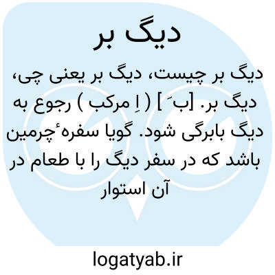 دیگ بر. [ب َ ] ( اِ مرکب ) رجوع به دیگ بابرگی شود. گویا سفره ٔچرمین باشد که در سفر دیگ را با طعام در آن استوار کنند. ( یادداشت مرحوم دهخدا ). دیگ و دیگ بر، از اتباع است. || دیگچه. ( یادداشت مرحوم دهخدا ).