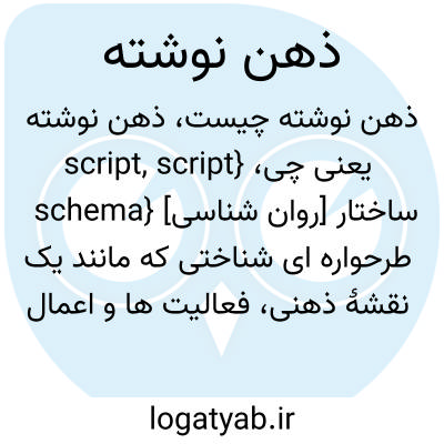 {script, script schema} [روان شناسی] ساختار طرحواره ای شناختی که مانند یک نقشۀ ذهنی، فعالیت ها و اعمال اصلی یک فعالیت پیچیده نظیر روابط زمانی و سببی آن را نمایش می دهد