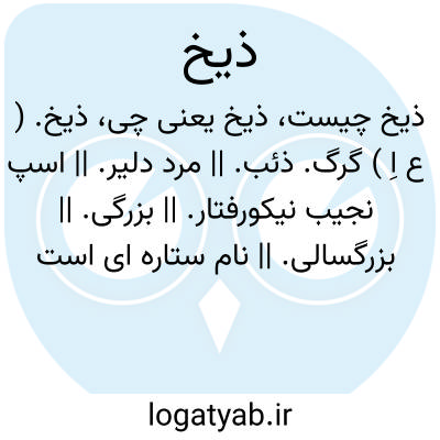 ذیخ. ( ع اِ ) گرگ. ذئب. || مرد دلیر. || اسپ نجیب نیکورفتار. || بزرگی. || بزرگسالی. || نام ستاره ای است سرخرنگ. || خوشه. || ذکر الضباع؛ کفتار نر بسیارموی. نعثل. ج، اَذیاخ، ذیوخ، ذَیَخَة: