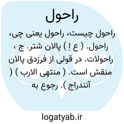 راحول. ( ع اِ ) پالان شتر. ج، راحولات. در قولی از فرزدق پالان منقش است. ( منتهی الارب ) ( آنندراج ). رجوع به راحولات شود.