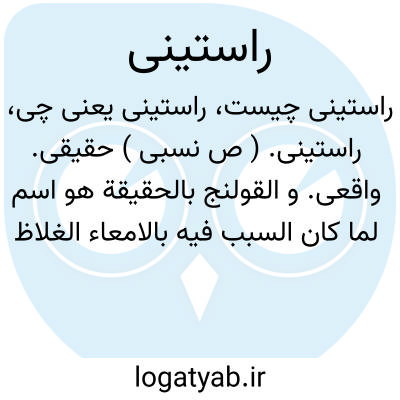 راستینی. ( ص نسبی ) حقیقی. واقعی. و القولنج بالحقیقة هو اسم لما کان السبب فیه بالامعاء الغلاظ قولون... و ان کان فی الامعاء الدقاق فالاسم المخصوص به بحسب المتعارف الصحیح. ( قانون ابن سینا ص 232 ): و کیلوس اندر جگر پخته شود و غذا راستینی شود و غذاء راستینی خون است. ( ذخیره خوارزمشاهی ). نضج راستینی جز دلیل سلامت نباشد و هر وقت که اثر نضج راستینی پدید آید بدان مقدار اندر بیماری امیدواری پدید آید و هرگز نشان نضج راستینی با نشانهای مرگ بیک جا نباشد. ( ذخیره خوارزمشاهی ). و بدین سبب قولنج راستینی آن را گویند که در این روده [ قولون ] افتد وقولنج راستینی پنج نوعست... ( ذخیره خوارزمشاهی ).