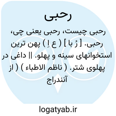 رحبی. [ رُ با ] ( ع اِ ) پهن ترین استخوانهای سینه و پهلو. || داغی در پهلوی شتر. ( ناظم الاطباء ) ( از آنندراج ) ( منتهی الارب ) ( از اقرب الموارد ). || جای زدن قلب. ( ناظم الاطباء ).