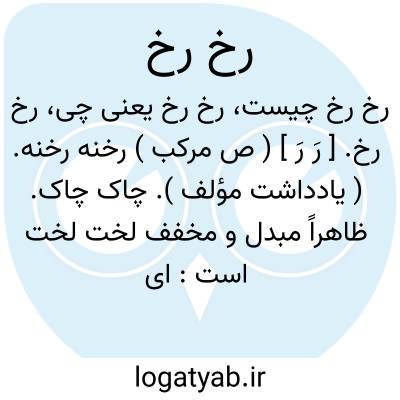 رخ رخ. [ رِ رِ ] ( اِ صوت ) رِخ. آواز دندان. ( فرهنگ نظام ). ژغ ژغ. و رجوع به رِخ شود.، رخرخ. [ رَ رَ ] ( ع ص )رَخْراخ. گِل تنک. ( ناظم الاطباء ) ( از منتهی الارب ) ( آنندراج ) ( از اقرب الموارد ). و رجوع به رخراخ شود.
