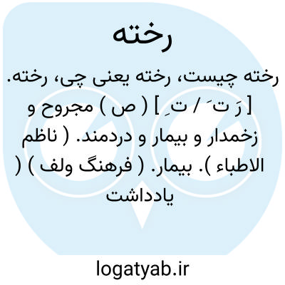 رخته. [ رَ ت َ / ت ِ ] ( ص ) مجروح و زخمدار و بیمار و دردمند. ( ناظم الاطباء ). بیمار. ( فرهنگ ولف ) ( یادداشت مؤلف ). خسته. ( از شعوری ج 2 ص 15 ).