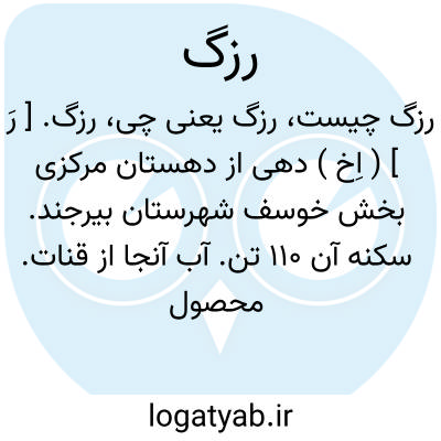 رزگ. [ رَ ] ( اِخ ) دهی از دهستان مرکزی بخش خوسف شهرستان بیرجند. سکنه آن 110 تن. آب آنجا از قنات. محصول عمده آنجا غلات وپنبه و میوه است. ( از فرهنگ جغرافیایی ایران ج 9 ).