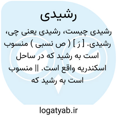 رشیدی. [ رَ ] ( ص نسبی ) منسوب است به رشید که در ساحل اسکندریه واقع است. || منسوب است به رشید که مردی از خوارج بود. || منسوب است به رشید ( هارون خلیفه عباسی ).( از انساب سمعانی ). || یکی از انواع چینی در عهد صفویه، و آن رنگارنگ و از حیث ضخامت متوسط بود. ( از جُنگ مورخ 1085 هَ. ق. متعلق به شاپور بختیار، یغما 15:12 ص 559، از فرهنگ فارسی معین ). || منسوب است به خواجه رشیدالدین فضل اﷲ همدانی.