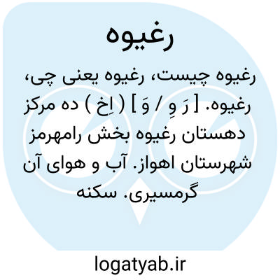 رغیوه. [ رَ وِ ] ( اِخ ) نام یکی از دهستانهای بخش رامهرمز شهرستان اهواز. این دهستان از شمال به بخش هفت گل و شهرستان شوشتر، از خاور به بخش هفت گل و رام هرمز، از جنوب به رود گوپال، از باختر به رودخانه کارون محدود است. رغیوه از 13 آبادی بزرگ و کوچک تشکیل شده و جمعیت آن در حدود 1600 تن است. قراء مهم دهستان عبارت است از: دره بید، البوتباره، شجیرات. مرکز دهستان رغیوه است. آب آن رود و چاه. محصول عمده آن غلات است. ( از فرهنگ جغرافیایی ایران ج 6 ).