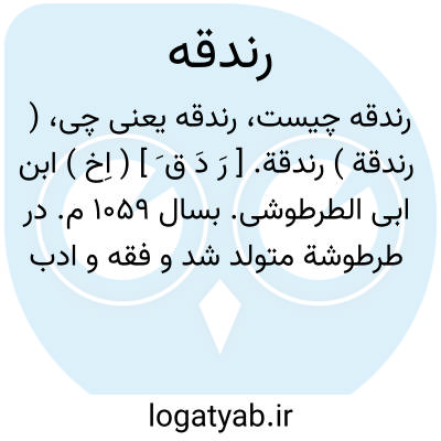 ( رندقة ) رندقة. [ رَ دَ ق َ ] ( اِخ ) ابن ابی الطرطوشی. بسال 1059 م. در طرطوشة متولد شد و فقه و ادب را در مولدخویش و در سرقسطه بیاموخت و در بغداد و بصره و دمشق و قدس و قاهره تعلم کرد و در اسکندریه اقامت گزید وبه عبادت پرداخت و به سال 1126 م. درگذشت. از تألیفات اوست: تحریم الاستمناء. خلاصة کشف البیان عن تفسیر القرآن لنیشابوری و سراج الملوک. ( از اعلام المنجد ).