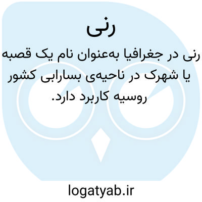 رنی. [ رُ ] ( اِخ ) قصبه ای است در ناحیه بسارابی از کشور روسیه واقعدر 43هزارگزی شمال غربی قضای اسماعیل. دارای اسکله است و 6080 تن جمعیت دارد. ( از قاموس الاعلام ترکی ).