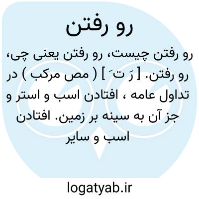 رو رفتن. [ رَ ت َ ] ( مص مرکب ) در تداول عامه، افتادن اسب و استر و جز آن به سینه بر زمین. افتادن اسب و سایر ستور و این عیبی است. قسمی سقوط اسب و استر. قسمی سکندری خوردن اسب و استر. افتادن اسب از سوی مقابل بر زانو. ( یادداشت مؤلف ).