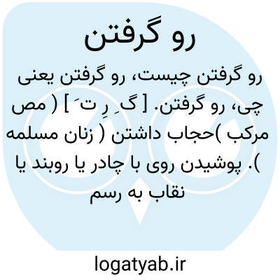 رو گرفتن. [ گ ِ رِ ت َ ] ( مص مرکب )حجاب داشتن ( زنان مسلمه ). پوشیدن روی با چادر یا روبند یا نقاب به رسم مسلمانان. در حجاب بودن. پوشیدن زن چهره را از مردان نامحرم. حجاب کردن زن. پرده کردن زن. حجاب چون زنان مسلم داشتن. ( از یادداشت مؤلف ). || پوشیدن رخ از شرم و حیاء و محجوب شدن. ( آنندراج ). پوشیدن رو. ( غیاث اللغات ):