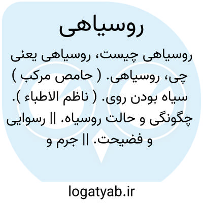 روسیاهی. ( حامص مرکب ) سیاه بودن روی. ( ناظم الاطباء ). چگونگی و حالت روسیاه. || رسوایی و فضیحت. || جرم و تقصیر خطا و گناه. ( ناظم الاطباء ):
