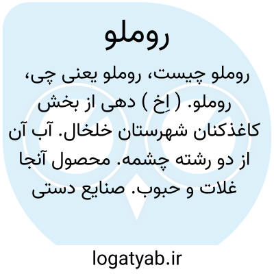روملو. ( اِخ ) دهی از بخش کاغذکنان شهرستان خلخال. آب آن از دو رشته چشمه. محصول آنجا غلات و حبوب. صنایع دستی زنان آنجا گلیم و جاجیم بافی. ( از فرهنگ جغرافیایی ایران ج 4 ).