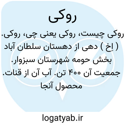 روکی. ( اِخ ) دهی از دهستان سلطان آباد بخش حومه شهرستان سبزوار. جمعیت آن 400 تن. آب آن از قنات. محصول آنجا غلات و میوه. ( از فرهنگ جغرافیایی ایران ج 9 ).