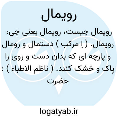 رویمال. ( اِ مرکب ) دستمال و رومال و پارچه ای که بدان دست و روی را پاک و خشک کنند. ( ناظم الاطباء ): حضرت خواجه ما قدس اﷲ روحه رویمال بر دوش مبارک خود انداخته بودند. ( انیس الطالبین ص 115 ). پیراهن و شیوجامه و رویمال آوردند که اینها را خاتون ملک به نیاز تمام بدست خود رشته است. ( انیس الطالبین ص 44 ). می خواهم... این رویمال را به او دهم. ( انیس الطالبین ص 116 ). رجوع به رومال و دستمال شود.