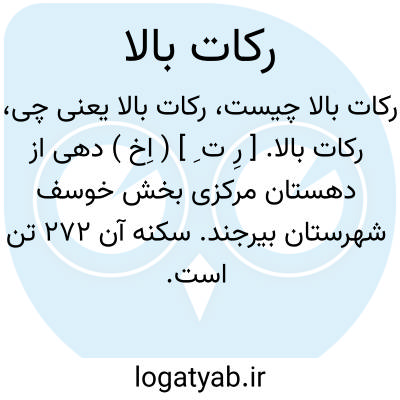 رکات بالا. [ رِ ت ِ ] ( اِخ ) دهی از دهستان مرکزی بخش خوسف شهرستان بیرجند. سکنه آن 272 تن است. آب آن از قنات. محصولات عمده آنجا غلات. صنایع دستی آنان قالیچه و گلیم بافی است. ( از فرهنگ جغرافیایی ایران ج 9 ).