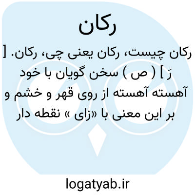 رکان. [ رَ ] ( ص ) سخن گویان با خود آهسته آهسته از روی قهر و خشم و بر این معنی با «زای » نقطه دار هم آمده. ( آنندراج ) ( برهان ) ( از شعوری ج 2 ورق 12 ). کسی که از روی خشم و قهر با خود آهسته آهسته سخن گوید. ( ناظم الاطباء ). رجوع به زکان و ژکان شود.