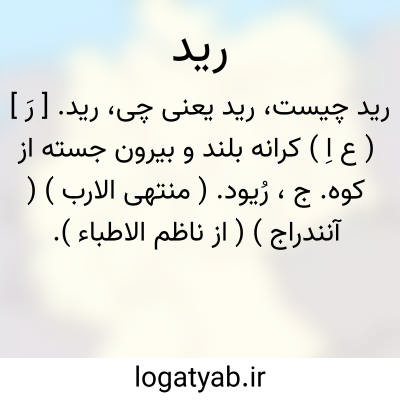 رید. [ رَ ] ( ع اِ ) کرانه بلند و بیرون جسته از کوه. ج، رُیود. ( منتهی الارب ) ( آنندراج ) ( از ناظم الاطباء ). تندی که از کوه بیرون خاسته بود. ج، اَریاد، ریود. ( مهذب الاسماء ).
