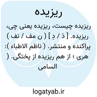 ریزیده. [ دَ / دِ ] ( ن مف / نف ) پراکنده و منتشر. ( ناظم الاطباء ): هری؛ از هم ریزیده از پختگی. ( السامی فی الاسامی ). || گداخته و ذوب شده. ( ناظم الاطباء ). || خردشده و ریزریزشده. ( ناظم الاطباء ). مُفَتَّت. متلاشی. ازهم پاشیده. پاشیده. ( یادداشت مؤلف ): جمله استخوانها و گوشت او ریزیده. ( ترجمه تفسیر طبری ). || ریخته: اقضم؛ دندان ریزیده. ( السامی فی الاسامی ). امعر؛ ریزیده موی. ( تاج المصادر بیهقی ). || پوسیده و فاسد شده. ( ناظم الاطباء ): رمیم؛ استخوان ریزیده. ( السامی فی الاسامی ). رفات؛ شمشیر کناره ریزیده. عظم رمیم؛ استخوان ریزیده. ( یادداشت مؤلف ): چون ما استخوانهای پوسیده و ریزیده باشیم. ( تفسیر ابوالفتوح رازی ج 5 ص 470 ). || آزرده. || ( اِ ) برگ درخت سرو. ( ناظم الاطباء ).