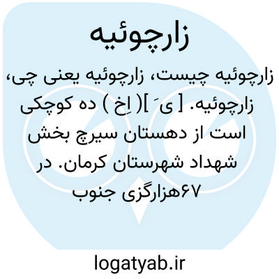 زارچوئیه. [ ی َ ]( اِخ ) ده کوچکی است از دهستان سیرچ بخش شهداد شهرستان کرمان. در 67هزارگزی جنوب باختری شهداد سر راه مالرو سیرچ به کرمان. ( از فرهنگ جغرافیائی ایران ج 8 )