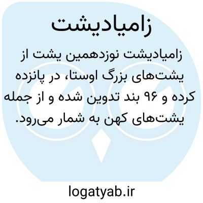 نوزدهمین یشت و یکی از یشت های بزرگ اوستا. این یشت، در پانزده کرده (بخش) و ۹۶ بند، در زمرۀ یشت های کهن قرار دارد و در جای جای آن زبان شاعرانه و حماسی دیده می شود. این یشت به دو بخش اصلی تقسیم می شود: فهرستی از کوه های سرزمین ایران (بندهای یک تا هشت)؛ ستایش فرّه (بندهای نُه تا ۹۶). از این رو مطالب این یشت مربوط به فرّه است و در آن فرّۀ اهورَه مزدا، فرّۀ امشاسپندان، و فرّۀ شاهان و قهرمانان اساطیری ستوده شده است. در این یشت، داستان گریز فرّه از جمشید، به شکل مرغ وارغنه، به سبب دروغگویی جمشید و تصاحب فرّ به دست ایزدمهر، فریدون، و گرشاسب به تفصیل بیان شده است. در دنبالۀ متن از ستیز سپندمینو و اهریمن بر سر به دست آوردن فرّه و از گریز فرّه به دریای فراخکرد و نیز از فرّۀ زردشت و گشتاسب و سوشیانس، آخرین منجی دین زردشتی و ظهور سوشیانس از دریای کیانْسه در سیستان و پیروزی خیر بر شرّ سخن به میان آمده است. ذکر دلاوری های گرشاسب، برشمردن رودها و کوه های ناحیۀ سیستان و ظهور سوشیانس از سیستان حکایت از ارتباط نزدیک زامیادیشت با سیستان دارد و احتمالاً تدوین نهایی یشت در سیستان بوده است. پورداود این یشت را به زبان فارسی ترجمه کرده است (تهران، ۱۳۴۷).