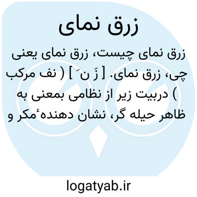 زرق نمای. [ زَ ن َ ] ( نف مرکب ) دربیت زیر از نظامی بمعنی به ظاهر حیله گر، نشان دهنده ٔمکر و فریب. دارای ظاهری فریبنده آمده: گفت کای ره نشین زرق نمای چه کسی و چه جای تست اینجای.نظامی ( هفت پیکر چ وحید ص 241 ).