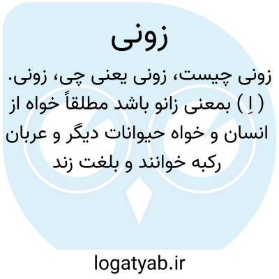 زونی. ( اِ ) بمعنی زانو باشد مطلقاً خواه از انسان و خواه حیوانات دیگر و عربان رکبه خوانند و بلغت زند وپازند نیز همین معنی دارد. ( برهان ) ( از جهانگیری ) ( از انجمن آرا ) ( از آنندراج ) ( از ناظم الاطباء ). لهجه ای است بمعنی زانو چنانکه در سنگسری «زونه »... طبری «زنی ». رجوع به زانو شود. ( حاشیه برهان چ معین ).