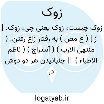 زوک. [ زَ ] ( ع مص ) به رفتار زاغ رفتن. ( منتهی الارب ) ( آنندراج ) ( ناظم الاطباء ). || جنبانیدن هر دو دوش در رفتن. || خرامیدن. || ( اِ ) رفتار زاغ. ( منتهی الارب ) ( آنندراج ) ( ناظم الاطباء ) ( از اقرب الموارد ).