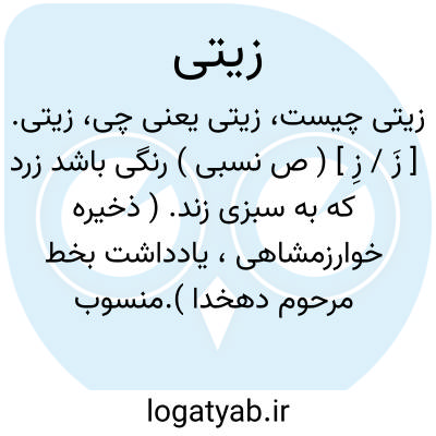 زیتی. [ زَ / زِ ] ( ص نسبی ) رنگی باشد زرد که به سبزی زند. ( ذخیره خوارزمشاهی، یادداشت بخط مرحوم دهخدا ).منسوب به زیت. به رنگ زیت. ( یادداشت ایضاً ). بیرونی در ذیل انواع جواهر و یاقوتها آرد:... ومن اشباهه الکرکهن فی جمیع انواعه، فمنه الخلوقی و الزیتی و الفستقی و... ( الجماهر ص 84 ). رجوع به همین کتاب ص 76 و 78 شود. و دلیل [ یعنی قاروره ] اندر بیشتر وقتها زیتی تمام باشد و گاه باشد که به سرخی گراید. ( ذخیره خوارزمشاهی، یادداشت بخط مرحوم دهخدا ).