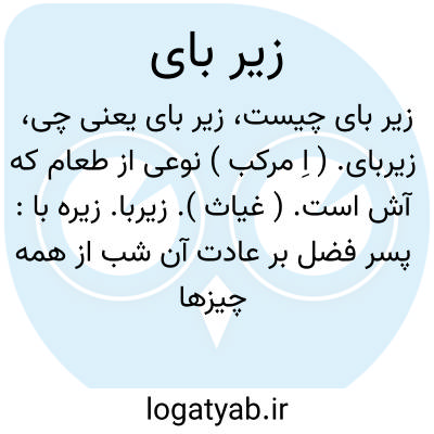 زیربای. ( اِ مرکب ) نوعی از طعام که آش است. ( غیاث ). زیربا. زیره با: پسر فضل بر عادت آن شب از همه چیزها بخورد و زیربای معقد ساخته بودند همه بکار داشت... دیگر روز جاثلیق بیامد و قاروره بخواست و بنگریست، رویش برافروخت و گفت... ترا از ترشیها و لبنیات نهی کرده ام تو زیربای خوری. ( چهارمقاله نظامی عروضی چ معین چ زوار ص 131 ). رجوع به زیره با و زیربا شود.