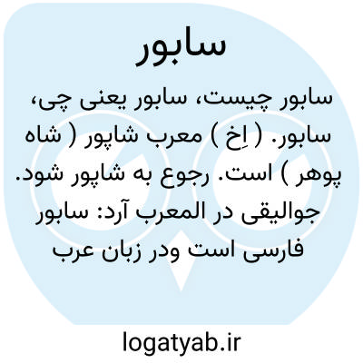 سابور. ( اِخ ) معرب شاپور ( شاه پوهر ) است. رجوع به شاپور شود. جوالیقی در المعرب آرد: سابور فارسی است ودر زبان عرب از قدیم آمده است. عدی بن زید گوید: