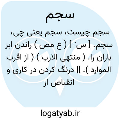 سجم. [ س َ ] ( ع مص ) راندن ابر باران را. ( منتهی الارب ) ( از اقرب الموارد ). || درنگ کردن در کاری و انقباض از آن. ( از اقرب الموارد ). || راندن چشم اشک را. ( منتهی الارب ) ( آنندراج ). راندن اشک. ( تاج المصادر بیهقی ) ( المصادر زوزنی ). ریختن اشک را. ( از اقرب الموارد ).
