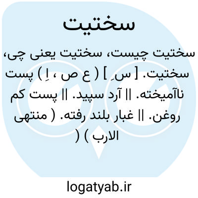 سختیت. [ س ِ ] ( ع ص، اِ ) پست ناآمیخته. || آرد سپید. || پست کم روغن. || غبار بلند رفته. ( منتهی الارب ) ( آنندراج ). || بسیار درشت از هر چیزی. ( منتهی الارب )( آنندراج ). || شدید. صلب. و اصل آن سخت فارسی است معرب شده به سختیت تغییر یافته است. || باریک از هر چیزی. ( المعرب جوالیقی ص 179 ).