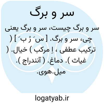 سر و برگ. [ س َ رُ ب َ ] ( ترکیب عطفی، اِ مرکب ) خیال. ( غیاث ). دماغ. ( آنندراج ). میل.هوی. خواهش: به سعی عاشقانه طبع او چون مایل افتاده سلیم از شوق آن دایم سر و برگ غزل دارد.محمدقلی سلیم ( از آنندراج ).ما به شوق ناله از بلبل به گلشن میرویم ورنه کی ما را سر و برگ تماشای گل است.ظفرخان احسن ( ازآنندراج ).