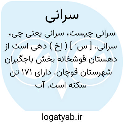 سرانی. [ س َ ] ( اِخ ) دهی است از دهستان قوشخانه بخش باجگیران شهرستان قوچان. دارای 171 تن سکنه است. آب آنجا از چشمه تأمین میشود. محصول آن غلات و شغل اهالی زراعت و مالداری و قالیچه و گلیم بافی و جوراب بافی است. ( از فرهنگ جغرافیائی ایران ج 9 ).