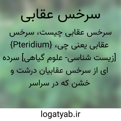 {Pteridium} [زیست شناسی- علوم گیاهی] سرده ای از سرخس عقابیان درشت و خشن که در سراسر جهان به جز نواحی بیابانی یافت می شوند؛ پراکندگی این سرخس ها احتمالاً از سرخس های دیگر گسترده تر است