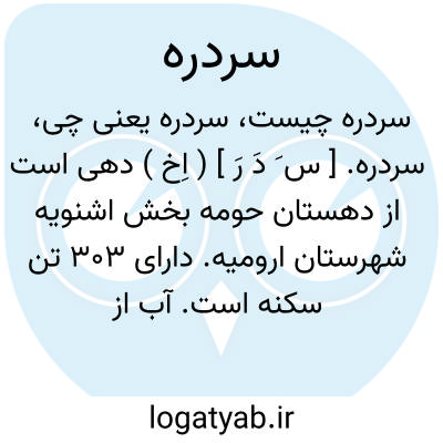 سردره. [ س َ دَ رَ ] ( اِخ ) دهی است از دهستان حومه بخش اشنویه شهرستان ارومیه. دارای 303 تن سکنه است. آب از مادرچای و محصول آن غلات، توتون، حبوبات است. ( از فرهنگ جغرافیائی ایران ج 4 ).