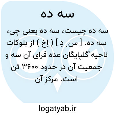 سه ده. [ س ِ دِ ] ( اِخ ) از بلوکات ناحیه ٔگلپایگان عده قرای آن سه و جمعیت آن در حدود 3600 تن است. مرکز آن قودجان. حد شمالی پشت کوه شرقی عربستان ( خوزستان )، جنوبی خوانسار و غربی که فریدن است. مساحت آن ده فرسخ است. ( از جغرافیای سیاسی کیهان ).، سهده.[ س َ دَ ] ( ع ص، اِ ) قابل اعتماد از سخن و جز آن. یقال: مارایت منه سهدة؛ ای امر اعتمد علیه من کلام او خبر. || ( اِمص ) بیداردلی. ( منتهی الارب ).