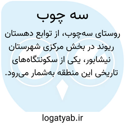 روستای سِه‌چوب، از توابع دهستان ریوند در بخش مرکزی شهرستان نیشابور، یکی از سکونتگاه‌های تاریخی این منطقه به‌شمار می‌رود. این روستا بر اساس آخرین سرشماری‌های انجام‌شده، جمعیتی بالغ بر ۱۴۱ نفر را در خود جای داده است. منبع اصلی تأمین آب برای مصارف کشاورزی و آشامیدنی در این منطقه، قنات‌های سنتی و دیرینه‌ای است که نشان از هوشمندی و تطابق ساکنان با شرایط جغرافیایی و اقلیمی ناحیه دارد.