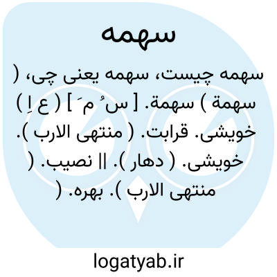 ( سهمة ) سهمة. [ س ُ م َ ] ( ع اِ ) خویشی. قرابت. ( منتهی الارب ). خویشی. ( دهار ). || نصیب. ( منتهی الارب ). بهره. ( دهار ).
