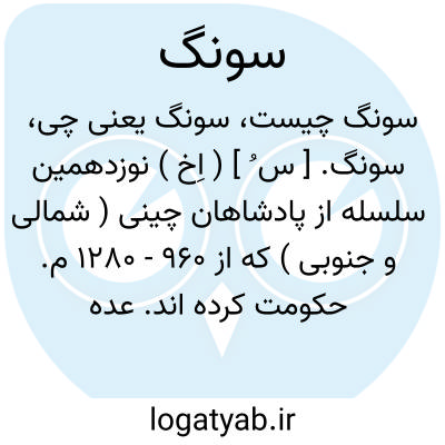 سونگ. [ س ُ ] ( اِخ ) نوزدهمین سلسله از پادشاهان چینی ( شمالی و جنوبی ) که از 960 - 1280 م. حکومت کرده اند. عده شاهان آن 18 تن است. آلتان خانیان از اقوام چورچه ( منچوری ) خروج کرده چین شمالی را از چنگ سونگها بیرون آوردند و فقط چین جنوبی بدست آنان ماند. سپس سلسله آلتان خانیان درعهد اکتای قاآن منقرض گردید و سلسله سونگ هم در عهد قوبیلای قاآن بکلی منقرض شد. ( فرهنگ فارسی معین ).